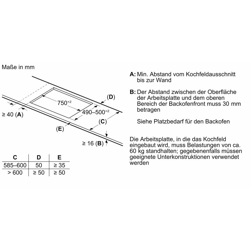 • Minimale Arbeitsplattenstärke: 16 mm
