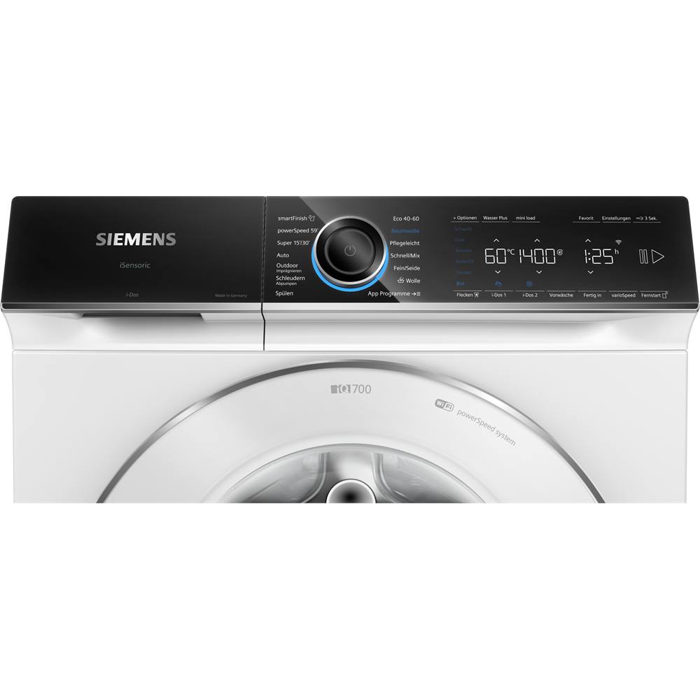 • touchControl-Tasten: Ein/Aus, Fertig in, Fleckenauswahl, i-DOS 2.0 1, i-DOS 2.0 2, Kindersicherung, Memory, Fernstart, Start / Pause mit Nachlegefunktion, Temperatur, varioSpeed, Vorwäsche, Drehzahlabwahl, Wasser Plus & Extra Spülen/ohne Schleudern