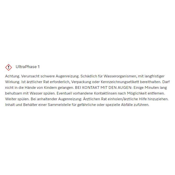 Warnhinweis auf weißem Hintergrund: „UltraPhase 1“. Achtung, verursacht Augenreizung, schädlich für Wasserorganismen. Bei Kontakt mit Augen spülen.