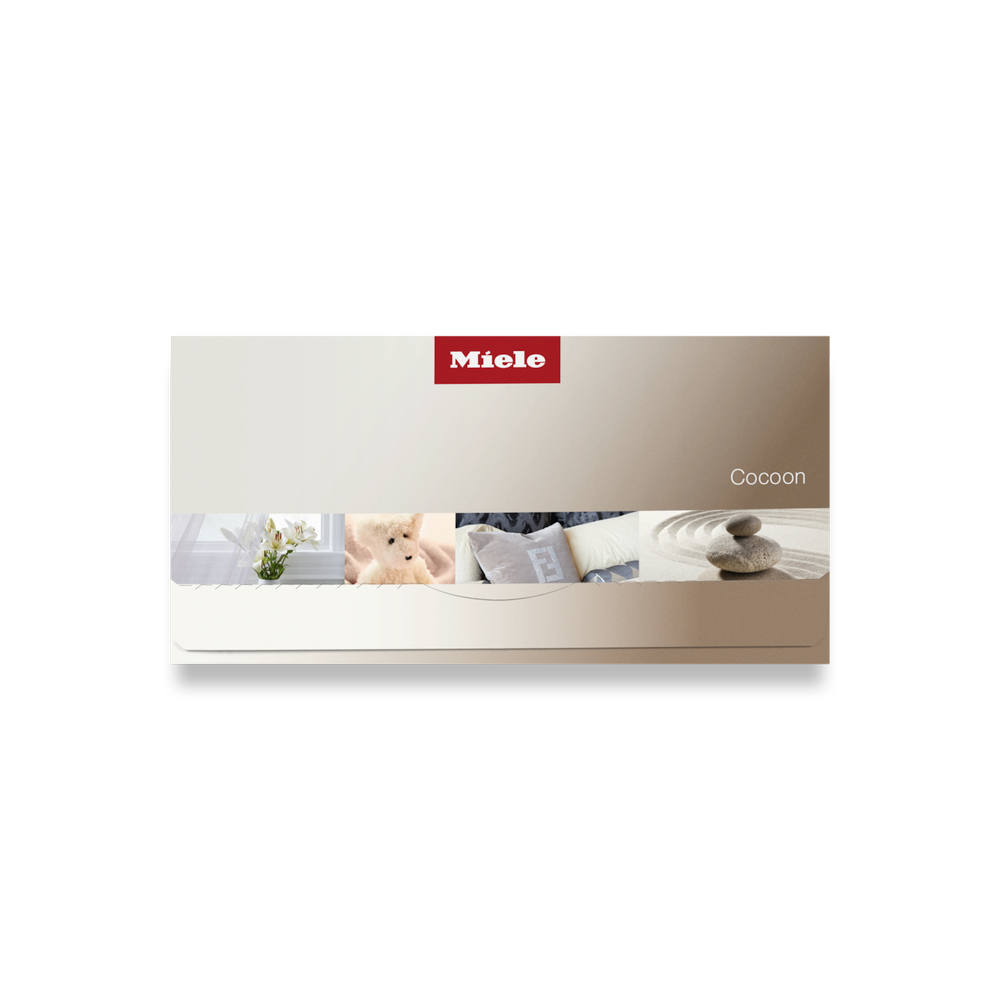 Werbeanzeige für Miele Cocoon. Wohnzimmer mit beigem Sofa, Kissen, Blumen und einer Teddybären-Dekoration.