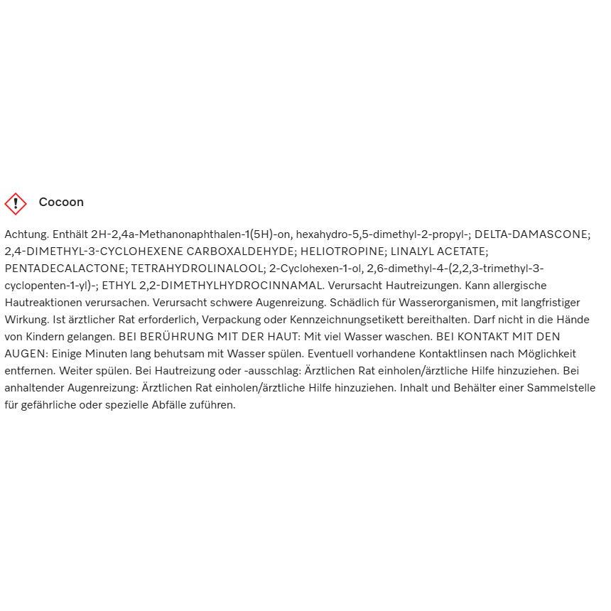 Warnhinweis auf Produktverpackung „Cocoon“. Enthält verschiedene chemische Verbindungen. Vorsicht vor Hautreizungen und Augenschäden. Entsorgungshinweise.