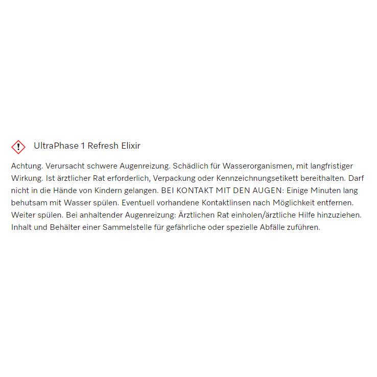 Warnhinweis auf weißem Hintergrund: „UltraPhase 1 Refresh Elixir“. Text beschreibt Gefahrenhinweise und Erste-Hilfe-Maßnahmen bei Augenkontakt.