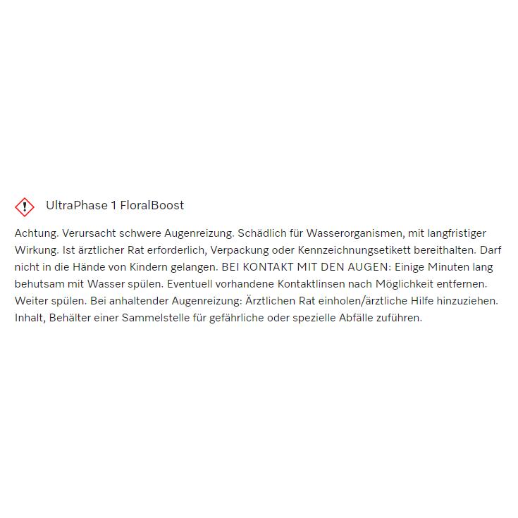 Warnhinweis auf weißem Hintergrund: „UltraPhase 1 FloralBoost“. Text beschreibt Gefahrenhinweise und Erste-Hilfe-Maßnahmen bei Augenkontakt.