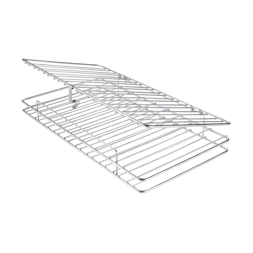Metall-Küchenregal mit mehreren horizontalen Ablageflächen, perspektivische Ansicht. Silberfarbenes Drahtgitterdesign.
