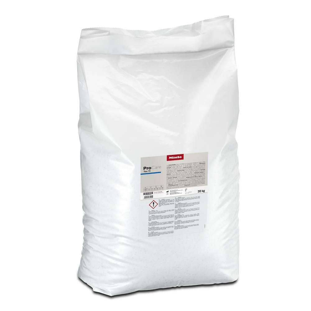 Weißer Sack mit der Aufschrift „Miele Procare Tab 11“. Gewicht: 20 kg. Warnhinweise und Gebrauchsanweisung sind sichtbar.