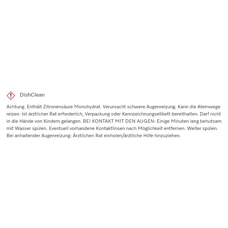 Warnhinweis auf einem Etikett: DishClean. Enthält Zitronensäure. Verursacht Augenreizung. Bei Kontakt mit den Augen spülen.