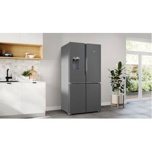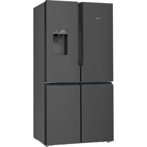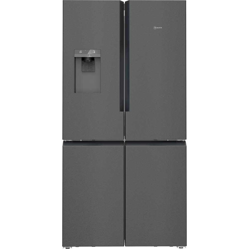 Dunkelgrauer Kühlschrank mit vier Türen, Wasser- und Eiswürfelspender oben links. Kühlschrank ist geschlossen.