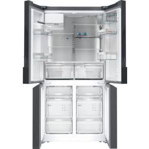 Dunkelgrauer Kühlschrank mit vier Türen, Wasser- und Eisdispenser. Oberer Bereich mit zwei Türen, darunter zwei Schubladen.