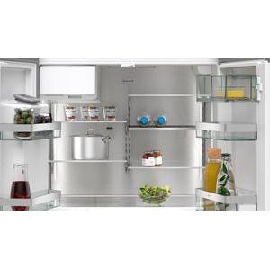 Kühlschrank mit offenem Türflügel. Innen sind Regalböden und Schubladen aus transparentem Kunststoff sichtbar. Edelstahlfront.