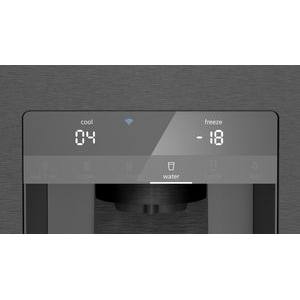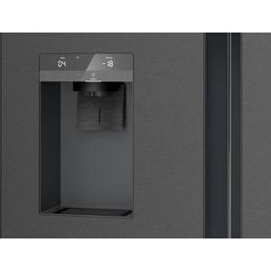 Dunkelgrauer Kühlschrank mit Eis- und Wasserspender. Digitales Display zeigt Temperaturwerte an.
