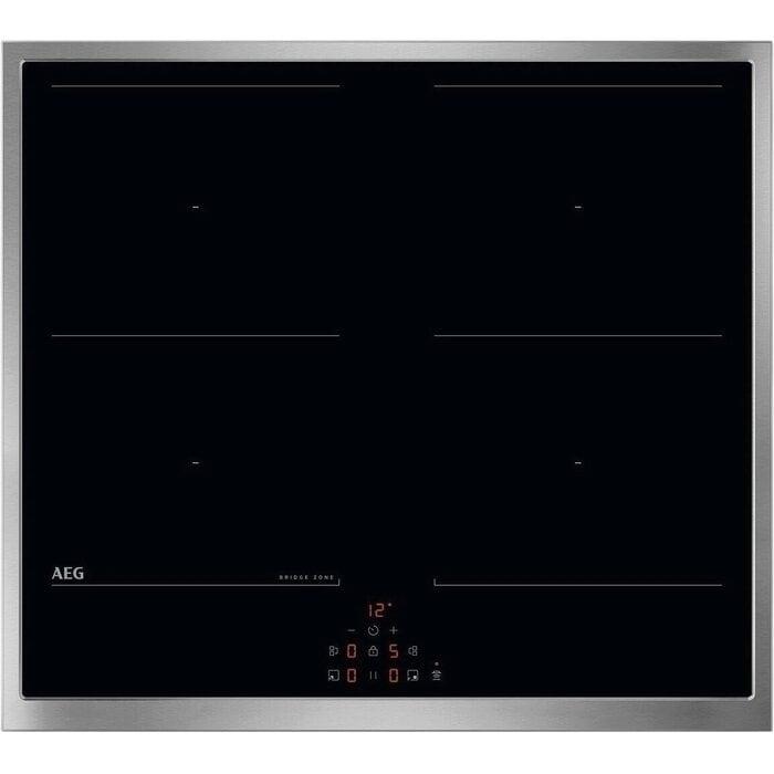 Cerankochfeld von AEG mit schwarzer Oberfläche und silbernem Rahmen. Digitale Anzeige für Einstellungen und Timer ist sichtbar.
