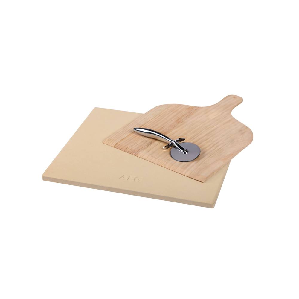 Mit dem AEG-Pizzaset kann Gourmetniveau leichter erreicht werden.Backen Sie knusprige Pizza auf dem widerstandsfähigen Naturstein. Heben Sie die Pizza mit dem Holzbrett mit Griff vom Stein. Schneiden Sie sie mit dem Edelstahl-Schneidemesser auf, und servieren Sie die fertige Pizza.