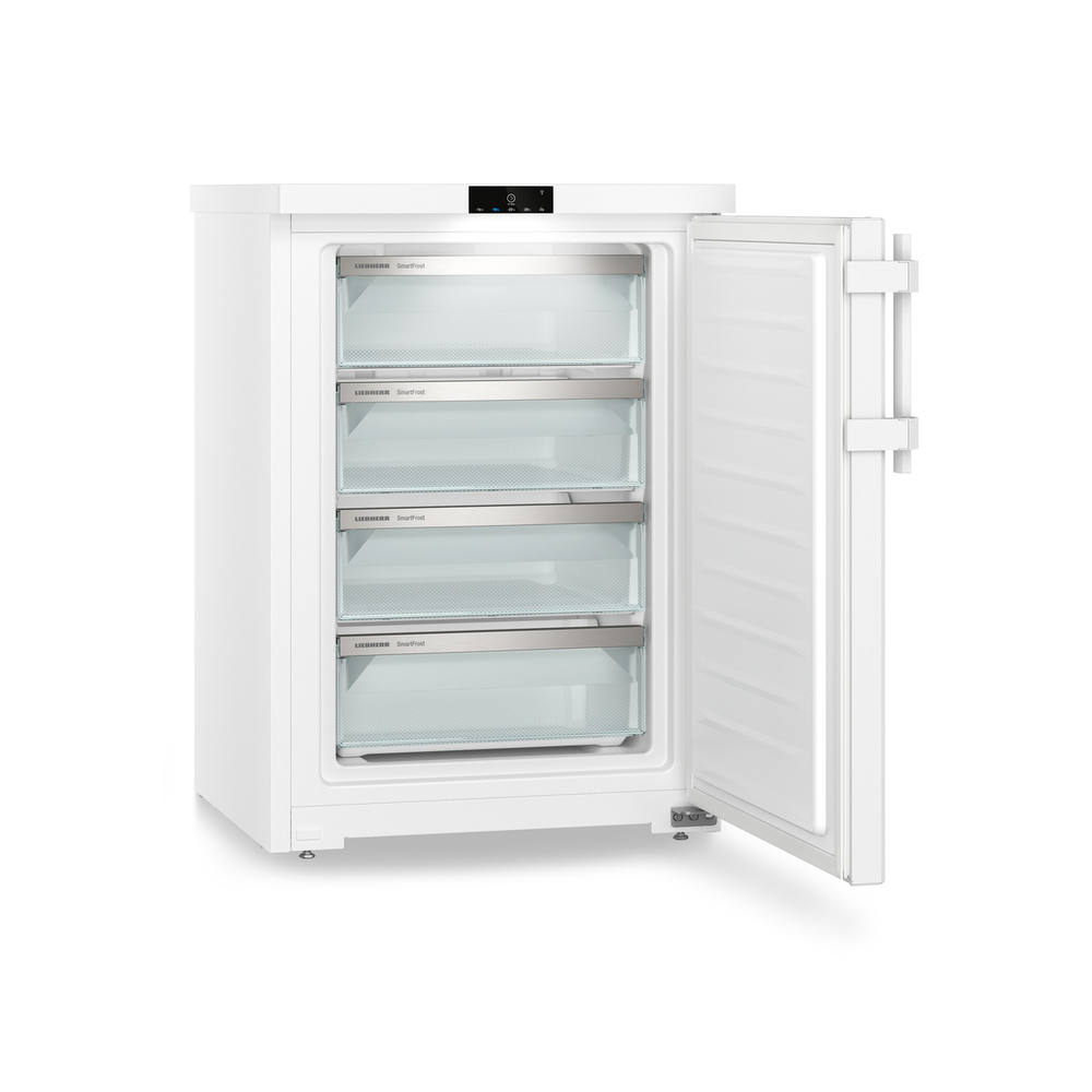 Weißer Liebherr Gefrierschrank, Tür geöffnet, mehrere Schubladen und Fächer im Inneren sichtbar.