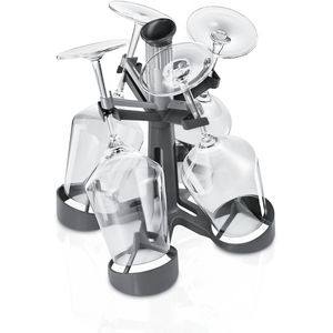Weinglashalter aus schwarzem Metall mit vier Weingläsern. Die Gläser stehen kopfüber auf dem Halter. Heller Hintergrund.
