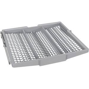 Grauer Geschirrkorb für Spülmaschine, unterteilt in Fächer für Teller, Tassen und Besteck. Gitterstruktur.