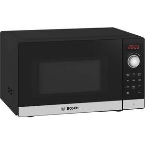 Mikrowelle mit schwarzer Front und silberner Blende. Digitales Display zeigt „20:25“. Bedienelemente für Zeit und Start/Stopp sind vorhanden. Bosch-Logo.