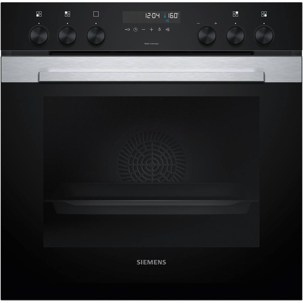 Backofen von Siemens mit Digitalanzeige „12:04“ und Bedienelementen. Im Inneren ist ein Backraum mit mehreren Einschüben und Beleuchtung erkennbar.